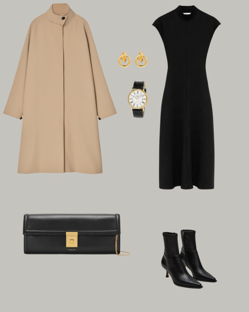 💼 Look 2: Collarless long coat + dress (one-piece elegance)