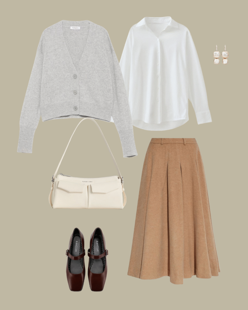 - Recommended item : V-neck knitted cardigan + mist blue/camel pleated skirt