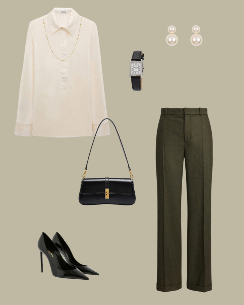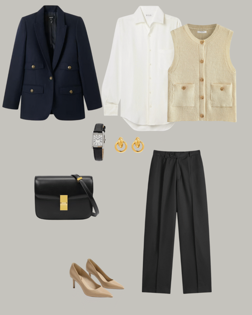 - Essentials: A sharply tailored blazer (gray/navy) + high-waisted tapered pants + crisp white shirt