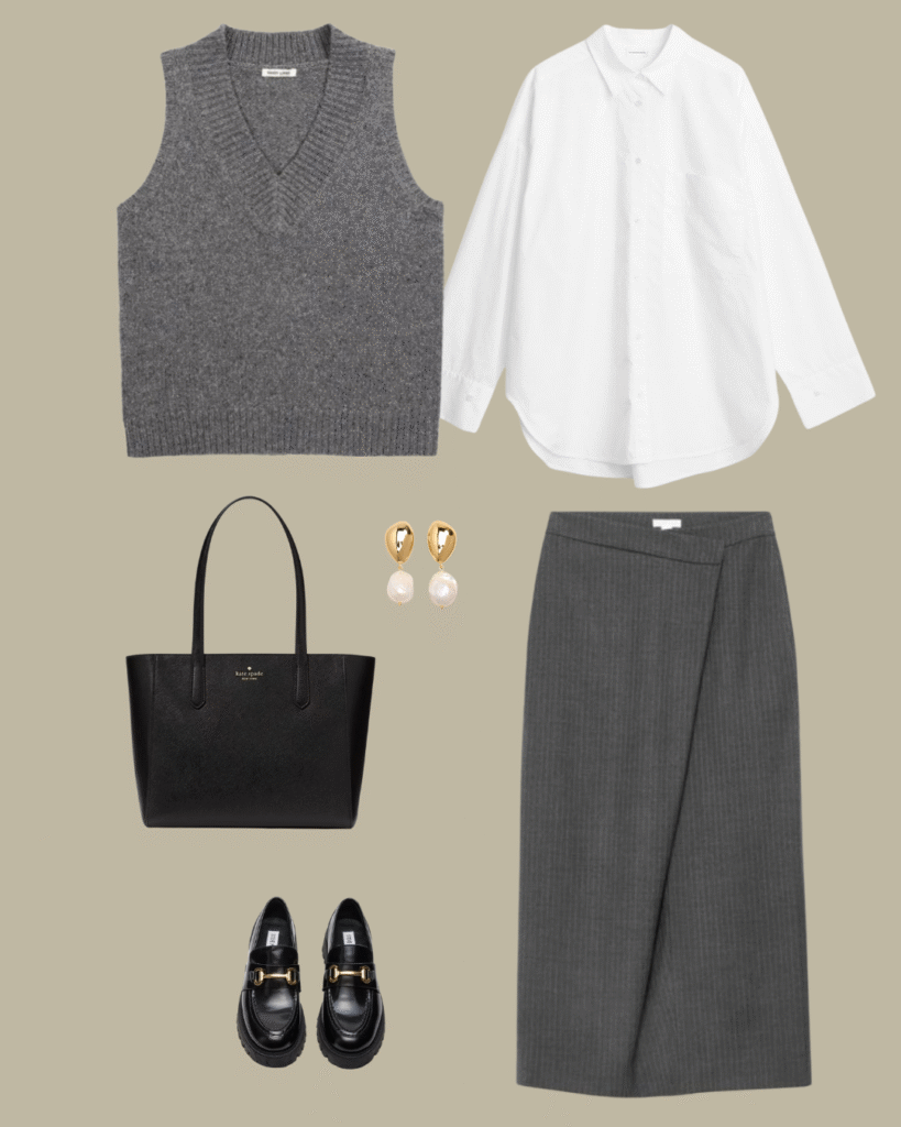☕ Look 5: Knitted vest + shirt + suit skirt