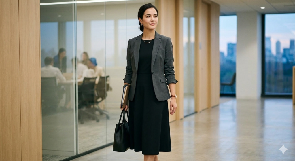 - The “9-to-9” Case Study: Imagine Sarah, a marketing executive. She wears a black midi dress in a 300g Ponte knit (a double-knit fabric that masks bra lines) to a 10:00 AM presentation with a grey blazer. At 6:00 PM, she swaps the blazer for gold statement earrings and a bold red lip.
